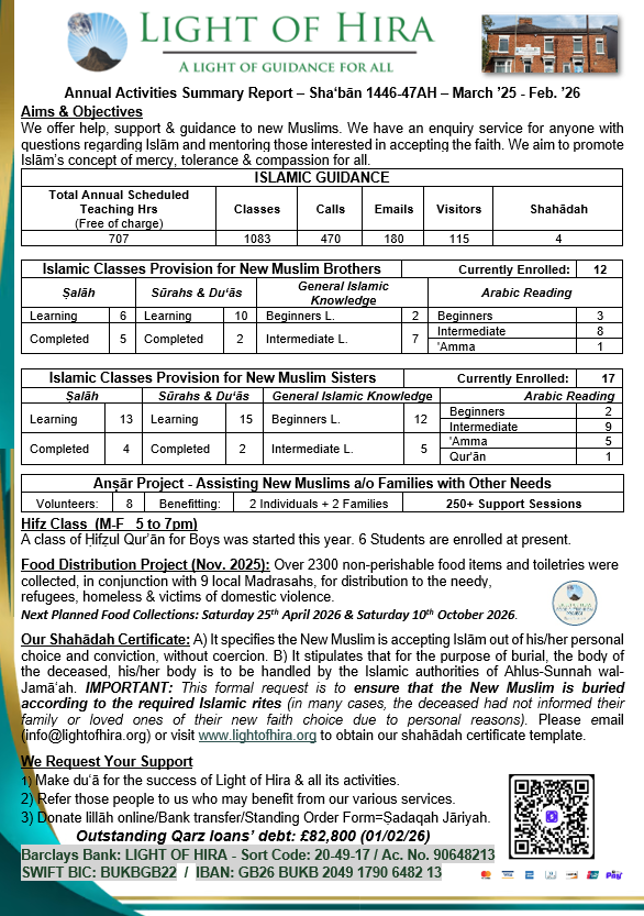 - Revive the Islamic concept of Charity and duty of care of the Muslims towards their Neighbours in the UK regardless of faith or background, e.g. in the form of Food Bank to support the homeless and/or including outreach work.